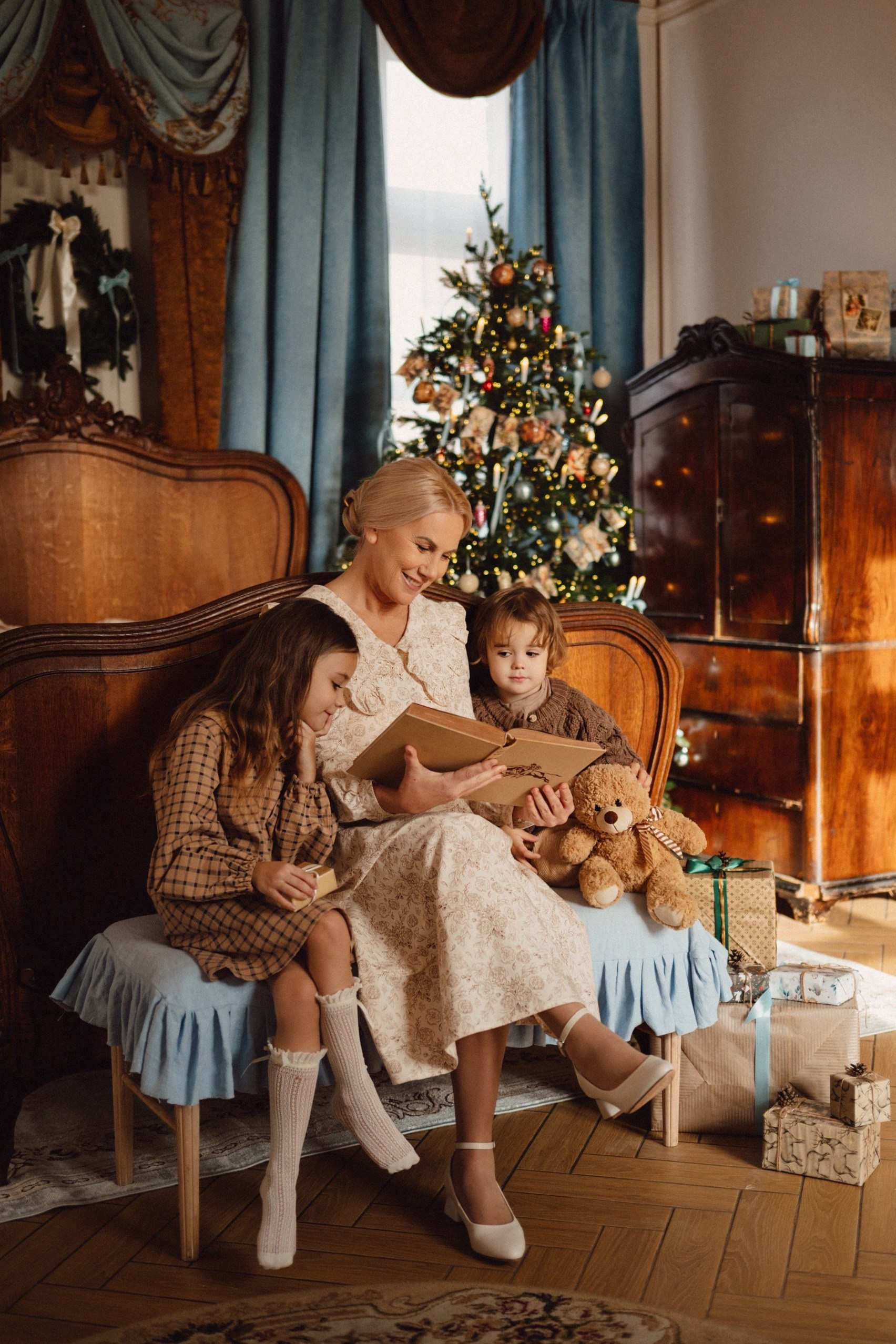Огромные книжные шкафы до самого потолка, камин с живым огнем помогают создать атмосферу настоящего домашнего тепла, добавляют уюта помещению и идеально подходят для семейных фотографий возле нарядной елочки.