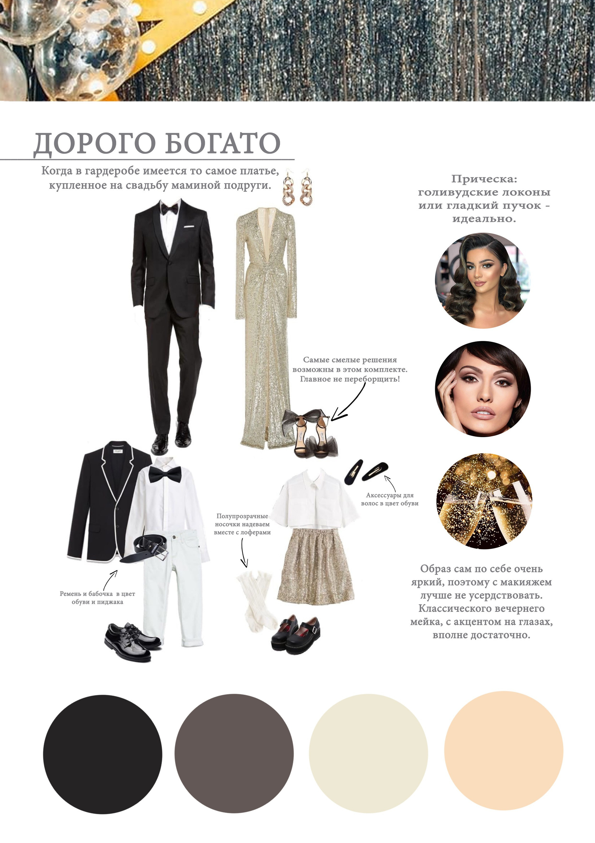Идеальным вариантом будут именно праздничные образы (платья) и костюмы. Акцентные цвета — Красный, изумрудный, серебро, золото, белый (или молочный)