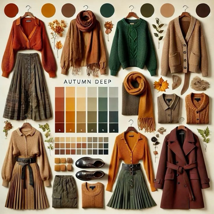 1. Теплые землистые тона: — Коричневый — Бежевый — Оливковый 2. Яркие акценты: — Бордовый — Горчичный — Тёмно-красный 3. Нежные пастельные оттенки: — Пудровый розовый — Светло-лавандовый — Мятный 4. Классические осенние цвета: — Тёмно-зелёный — Синий индиго — Серый 5. Металлические акценты: — Золотой — Бронзовый