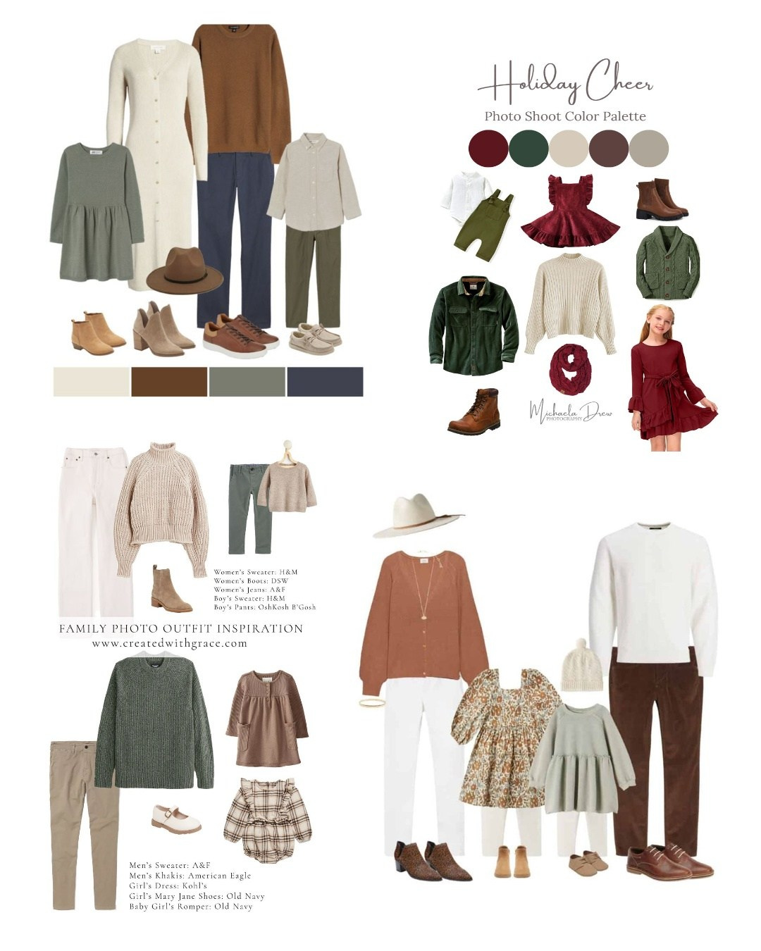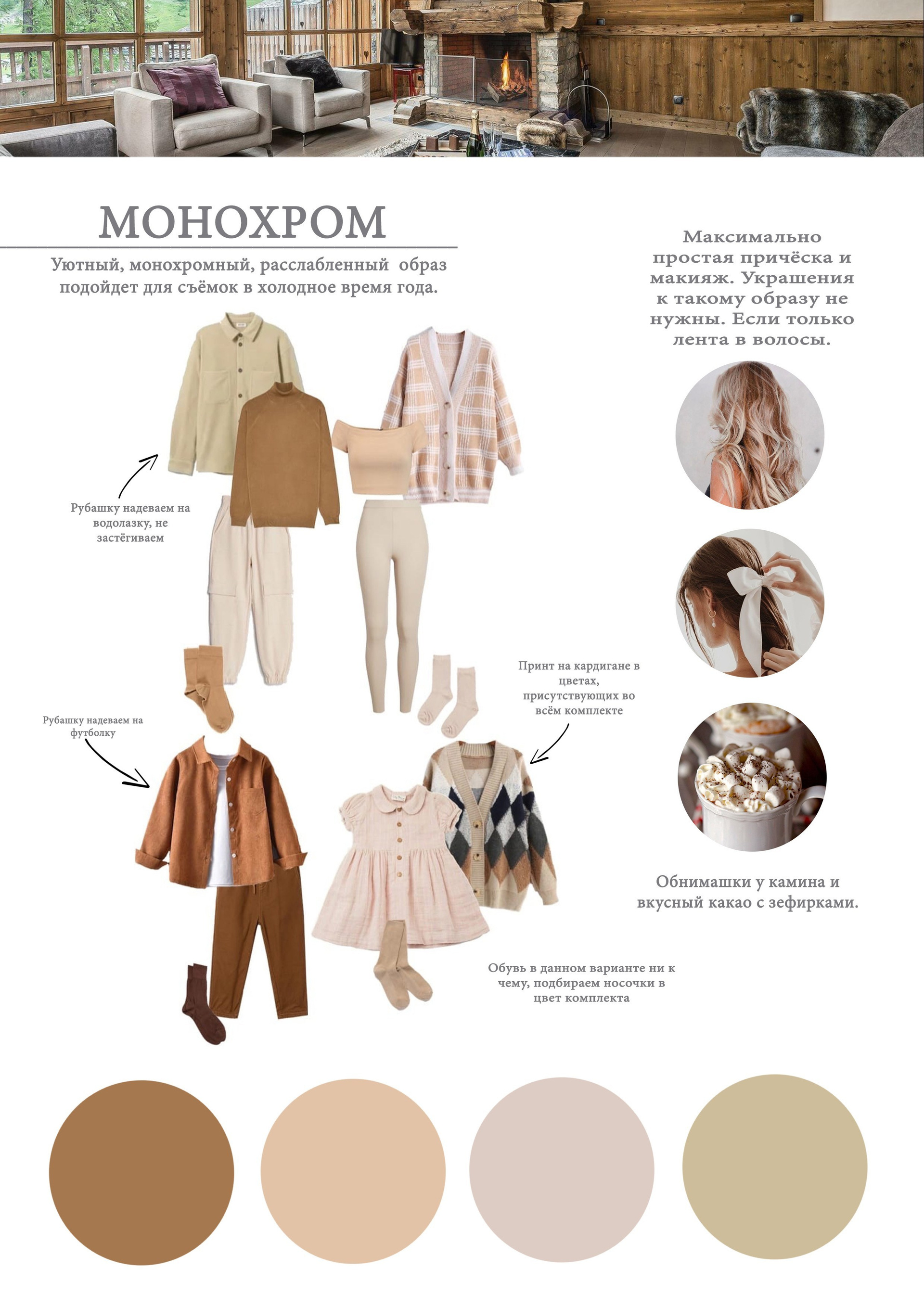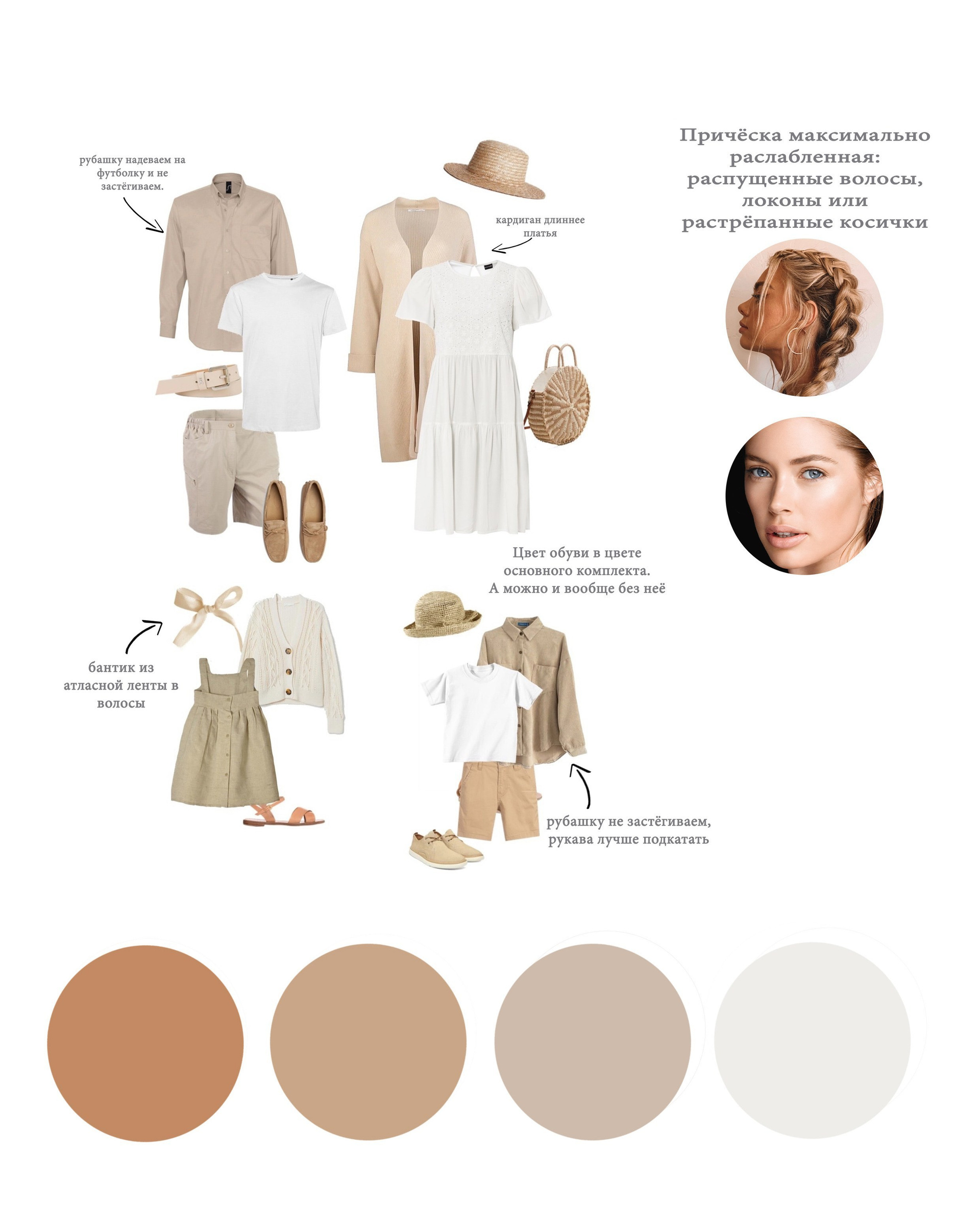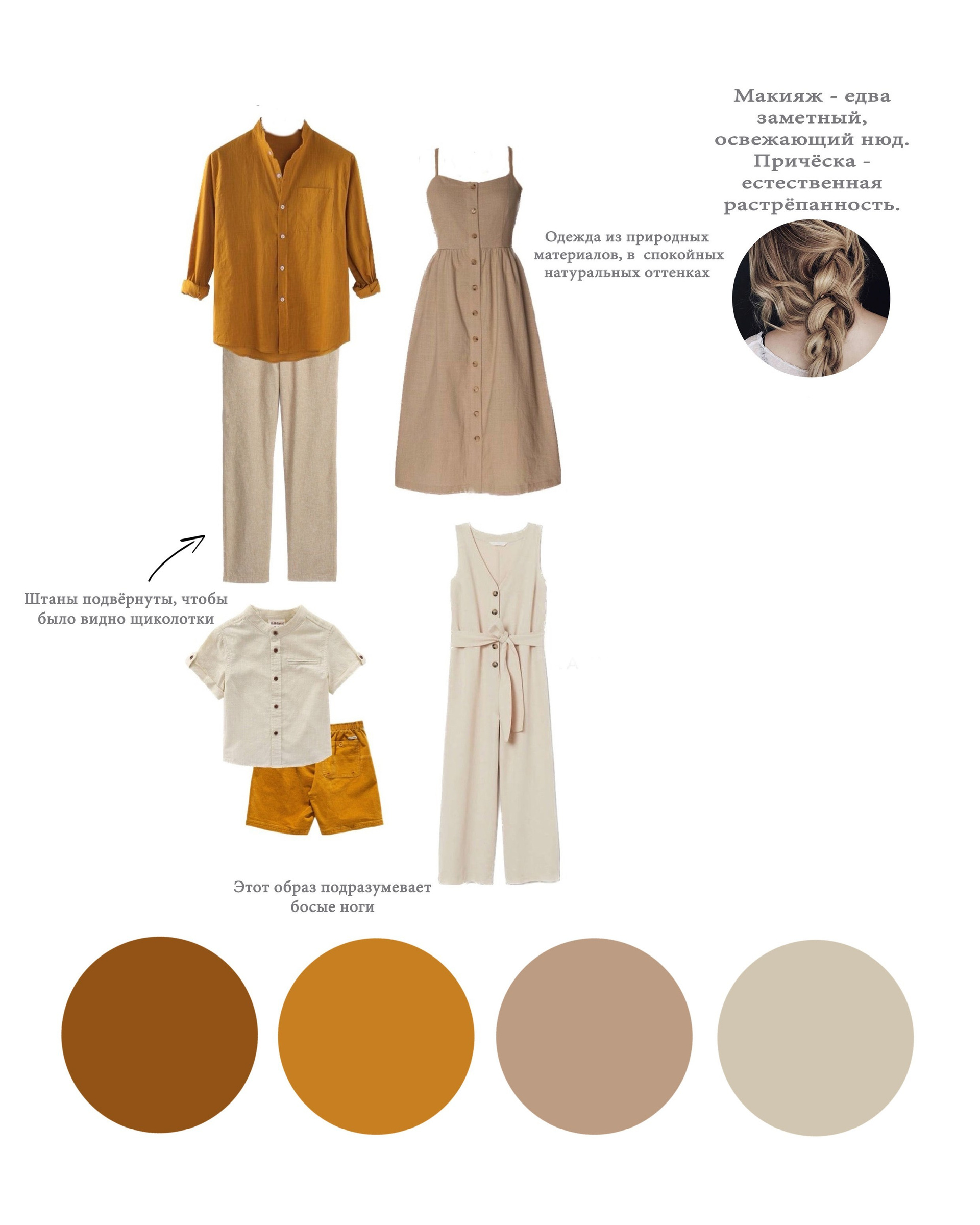 Подходящая палитра указана ниже, я прикреплю примеры образов одежды для всей семьи. Если нет вариантов в данных палитрах — нас спасет образ в белом. Постарайтесь достать все из гардероба и подобрать похожие вещи исходя из данных рекомендаций. Если у вас возникнут проблемы в подборе образов или вопросы — В самом низу нажмите на кнопку «Помощь»